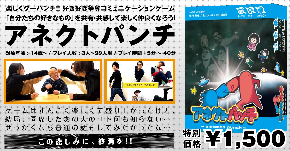 アネクトパンチ(annecto punch)は東京ビッグサイトにて行われるゲームマーケット2018春「【E35-36】ブース:グランドアゲームズ」にて【特別販売価格:1,500円(税込)】で販売されます。